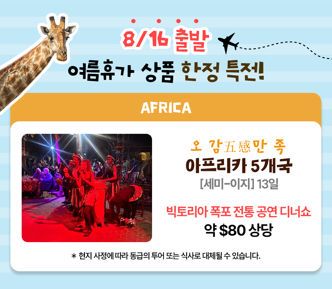| [세미-이지] 오감만족 아프리카 5 개국 13일 남아공 / 나미비아 / 짐바브웨 / 잠비아 / 보츠와나 | 7,690,000원 | 7,690,000원 | 7,690,000원 | |