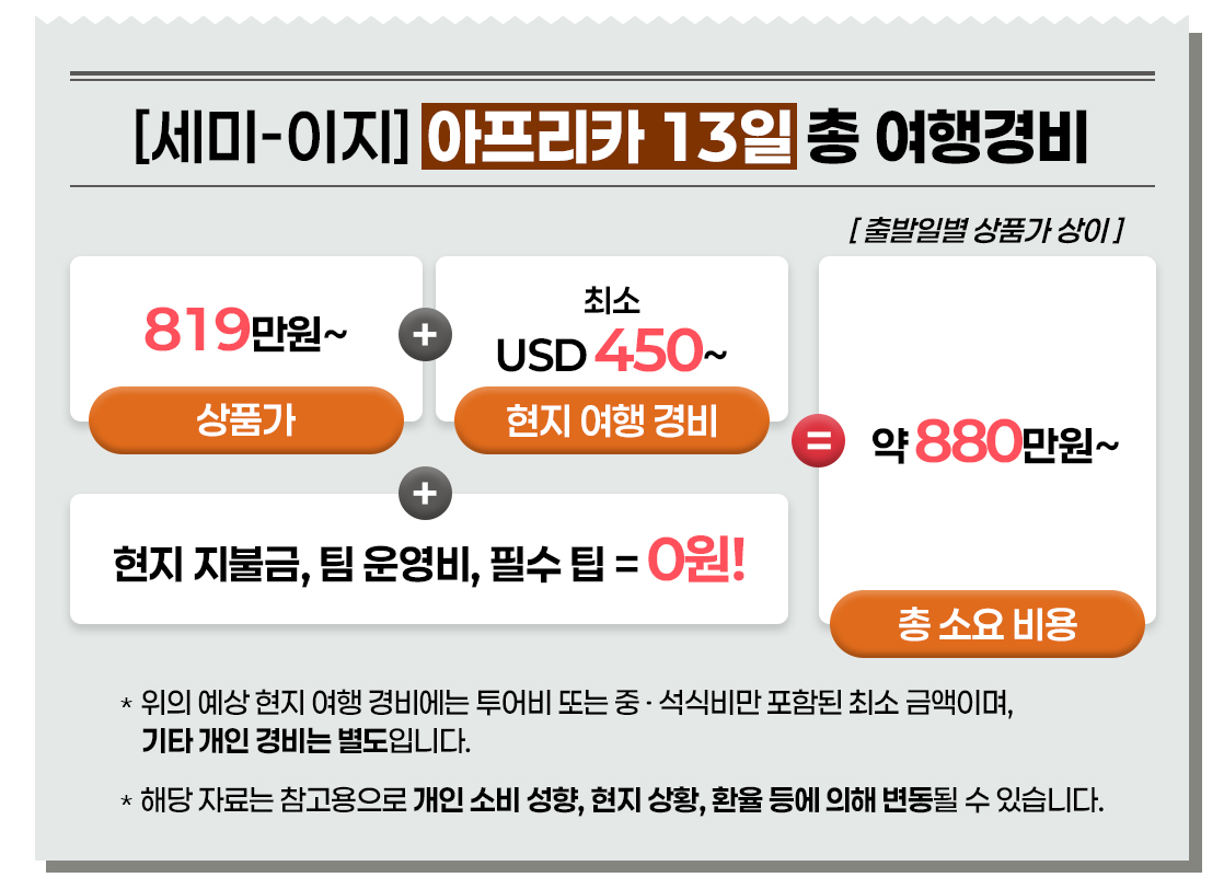 | [세미-이지] 오감만족 아프리카 5 개국 13일 남아공 / 나미비아 / 짐바브웨 / 잠비아 / 보츠와나 | 8,690,000원 | 8,690,000원 | 8,690,000원 | |